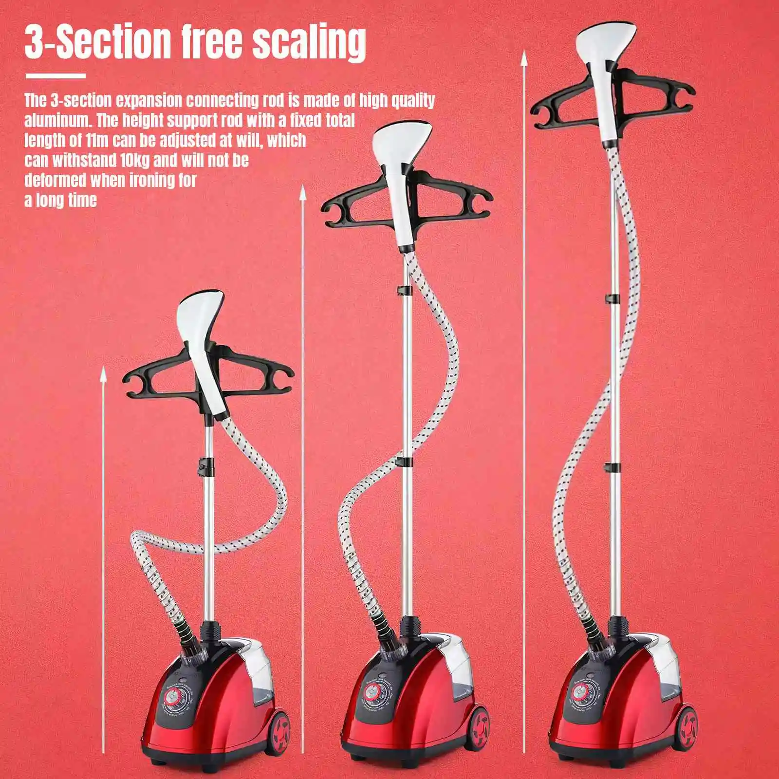 Hanging on the machine, triple anti dry burning, full electrical safety protection, one heavy care and one heavy guarantee, adding a sense of peace of mind in softness. Stable hanger, flexible and easy to use. 11 levels of ironing, better steam control, allowing steam to accurately match different clothes, keeping clothes undamaged and safely wrinkle removing. 6-hole steam outlet, further steam, more powerful and large ironing experience, saving time, effort and worry. 98 ° three-dimensional steam sterilization and cockroach removal, safe clothing care. Ultra low decibels.