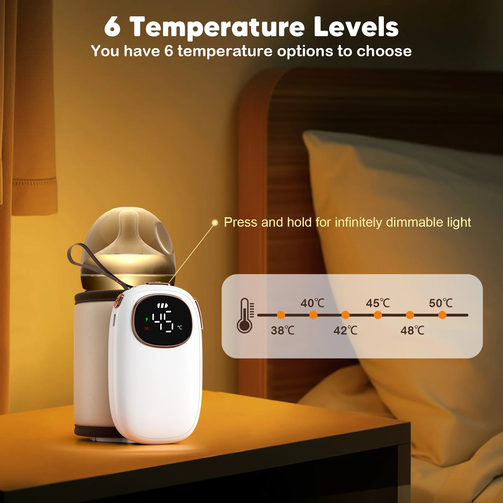 Large digital screen shows real-time heat levels. Built-in light makes nighttime feeding simple.